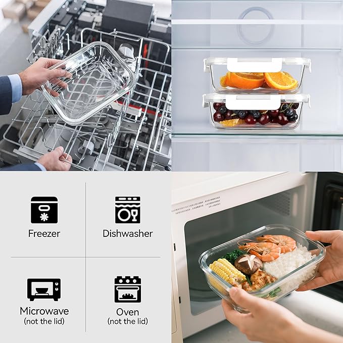 • AIRTIGHT SEALED LIDS: Equipped with BPA-free plastic lids featuring silicone seals, these glass storage containers with lids keep your food fresh longer while preventing leaks and spills. Ideal for bringing meals to work, the gym, or on picnics.