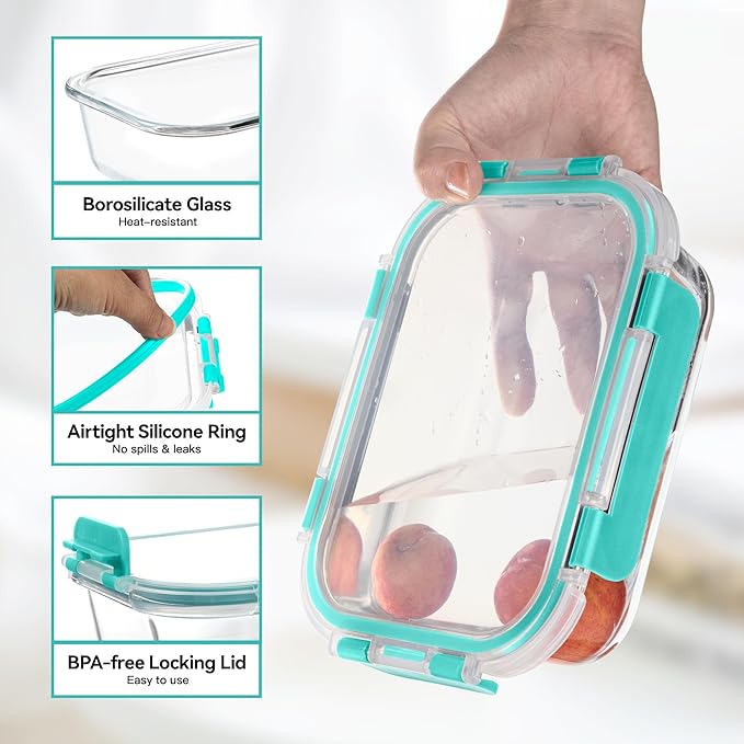 • AIRTIGHT SEALED LIDS: Equipped with BPA-free plastic lids featuring silicone seals, these glass storage containers with lids keep your food fresh longer while preventing leaks and spills. Ideal for bringing meals to work, the gym, or on picnics.