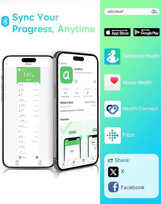 • Accurate Health Monitoring: Experience hassle-free health tracking with the arboleaf smart scale; Featuring Bluetooth connectivity and precision sensors, it lets you measure weight, body fat, BMI, and muscle mass with ease and confidence