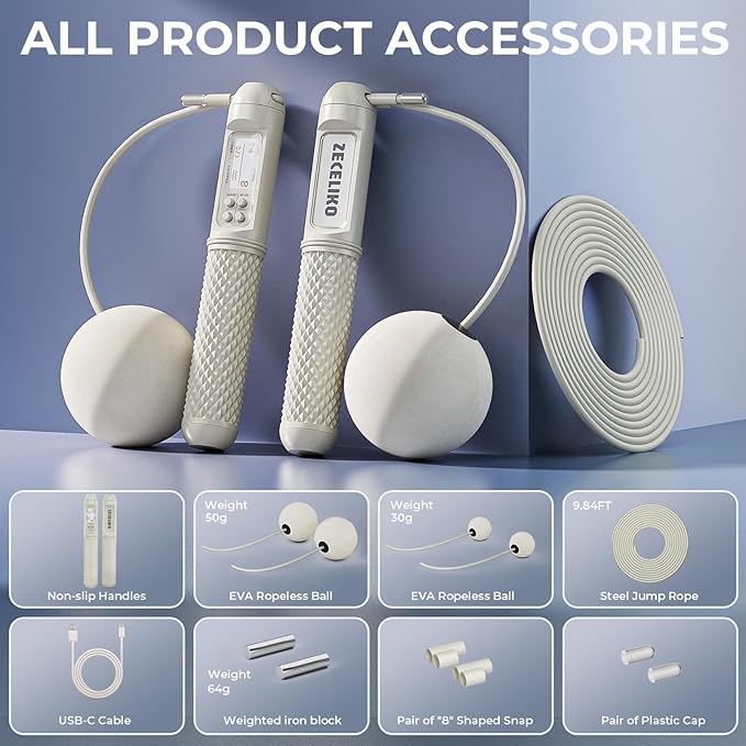 • 3.Weighted & Cordless Jump Rope: Includes four EVA foam balls (two 30g and two 50g) for silent cordless jumping; switch instantly between cordless and traditional modes; great for low ceilings or noise-sensitive areas; the included 64g iron weights attach to the handles for extra resistance, perfect for HIIT or strength training