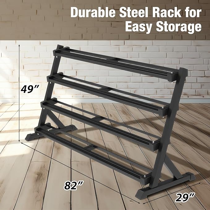 • Space-Saving Design: The Commercial Grade 4-tier dumbbell rack is designed to optimize floor space in your gym. Its compact 4-tier angled layout makes your complete set of 5 to 100 lb. hex dumbbells easily accessible while keeping your workout area organized and clutter-free