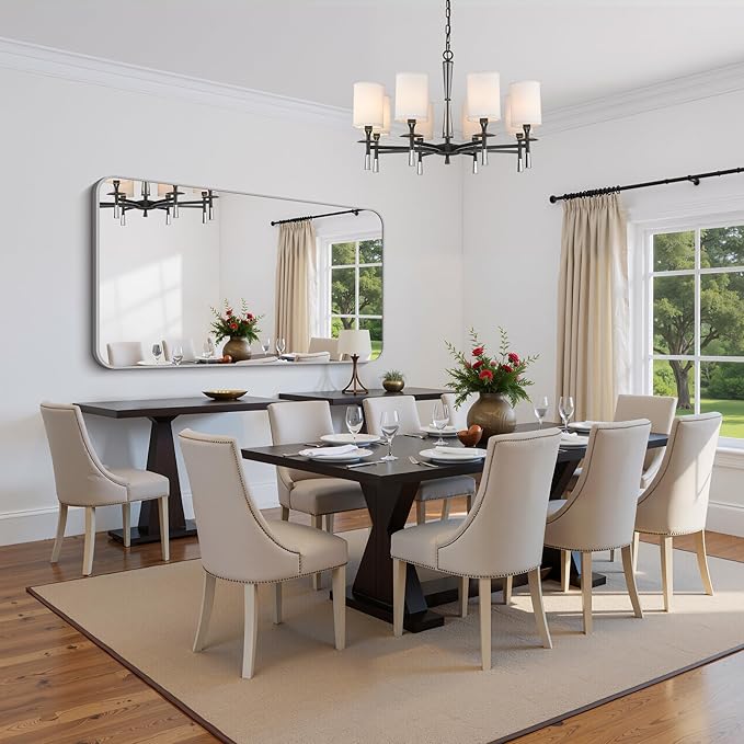 • Elegant Rounded Corners & Premium Safety: Featuring a sleek silver metal frame with softly contoured rounded corners. This sophisticated design combines modern elegance with enhanced safety, eliminating sharp edges while adding a luxe minimalist finish. The rich black frame elevates any decor, creating a visually expansive effect that brightens spaces and amplifies the sense of openness.
