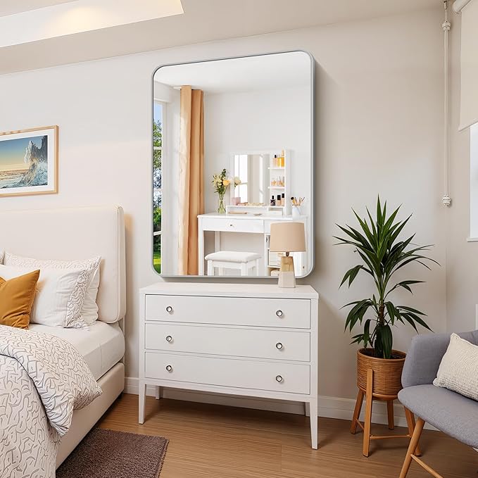 • Elegant Rounded Corners & Premium Safety: Featuring a sleek silver metal frame with softly contoured rounded corners. This sophisticated design combines modern elegance with enhanced safety, eliminating sharp edges while adding a luxe minimalist finish. The rich black frame elevates any decor, creating a visually expansive effect that brightens spaces and amplifies the sense of openness.