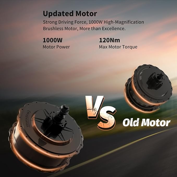 • 1000W high-speed brushless motor provides e-bike max speed up to 31 mph. 26"x4" wearproof fat tires fit for multiple terrains, excellent grip and skid resistance. 85N·M of torque, suitable for riding on beach, snow, rough terrain and street.