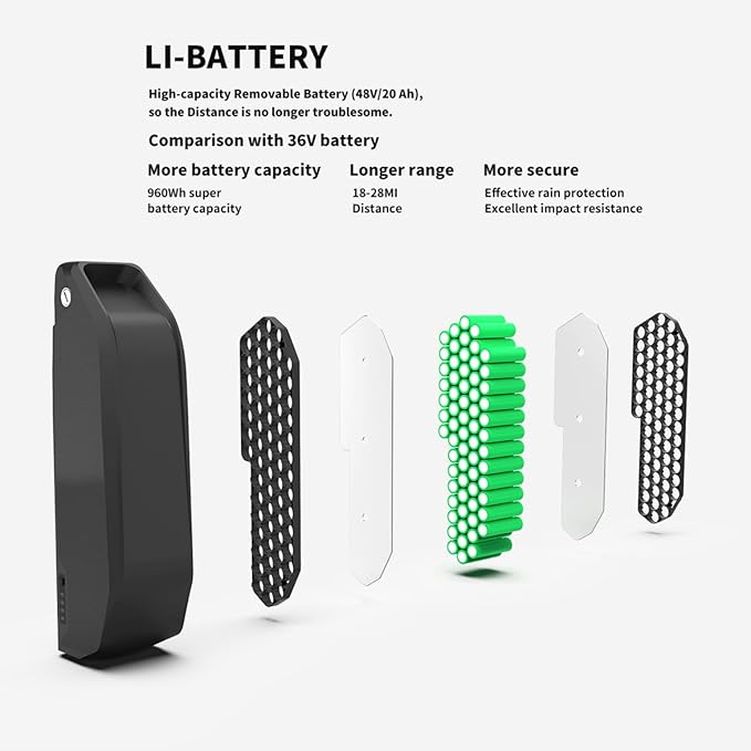• Ebike with 48V 20Ah removable large capacity lithium battery, 4-6 hours fast charging. Battery is removable, waterproof and convenient to bring home or office for charging.