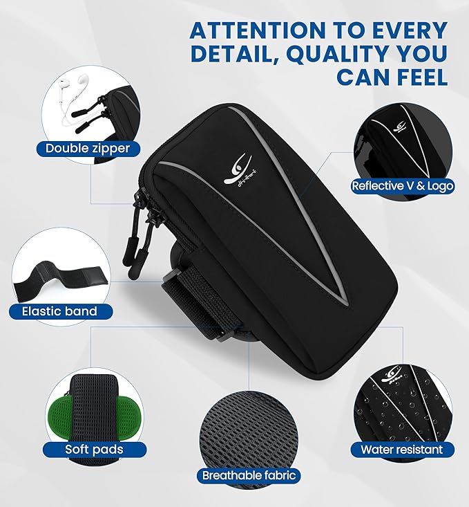 • Reflective & Water-Resistant for Safety: Stay safe on early morning or late-night runs thanks to the reflective ‘V’ strip and logo, providing high visibility in low light. The premium water-resistant fabric shields your gear from sweat and unexpected weather, keeping your phone and valuables dry and protected.