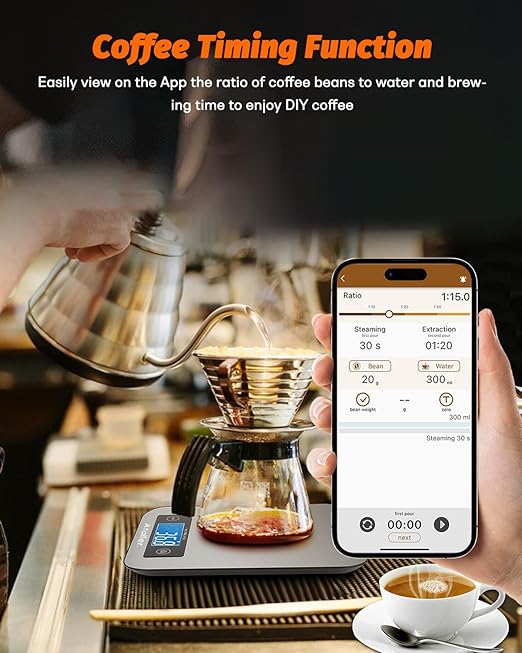 • Smart APP: Download the SmartApple app to track and record food data, calculate calories, offer a detailed nutritional analysis; Combined with nutritional scale, kitchen scale, and coffee scale together, Coffee timer function displays the ratio between coffee beans and water, record time, and weight beans