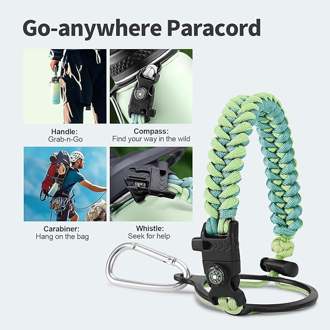 • Palm Fitting Paracord Handle: Compared to handle lids, nylon paracord on the bottle gives you more choices in terms of color coordination and coziness on your hands. Match the handle with your bottle to make a complete outdoorsy look. Compass and carabiner can be lifesavers for hiking and other expeditions