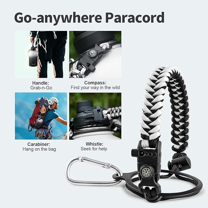 • Palm Fitting Paracord Handle: Compared to handle lids, nylon paracord on the bottle gives you more choices in terms of color coordination and coziness on your hands. Match the handle with your bottle to make a complete outdoorsy look. Compass and carabiner can be lifesavers for hiking and other expeditions