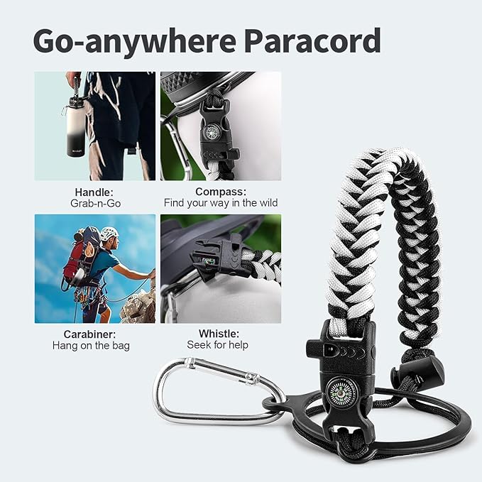 • Palm Fitting Paracord Handle: Compared to handle lids, nylon paracord on the bottle gives you more choices in terms of color coordination and coziness on your hands. Match the handle with your bottle to make a complete outdoorsy look. Compass and carabiner can be lifesavers for hiking and other expeditions