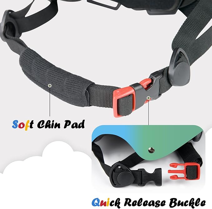• Fully adjustable, provided by the crank adjustment dial, 2 sets of pads with different thickness, and length-adjustable chin straps
