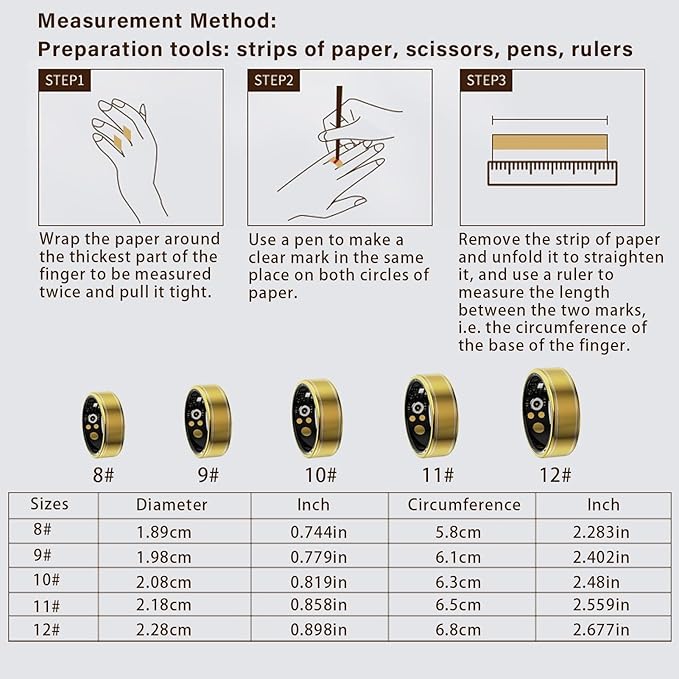 • 【Select the Right Size】: Measure your finger circumference using our size guide to ensure the best fit. The Anarow smart health ring is available in 8 sizes. If your measurement is between sizes, we recommend choosing the larger size for added comfort and accurate sensor performance