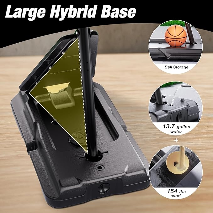 • Rock-Solid Stability: Engineered for stability, our basketball goal outdoor features a massive 44” x 28” base (filled with 13.7 gallons water or 154 lbs sand). Its triangular support structure with guard plate withstands any weather, eliminating tipping risks. Play confidently, no matter the game intensity