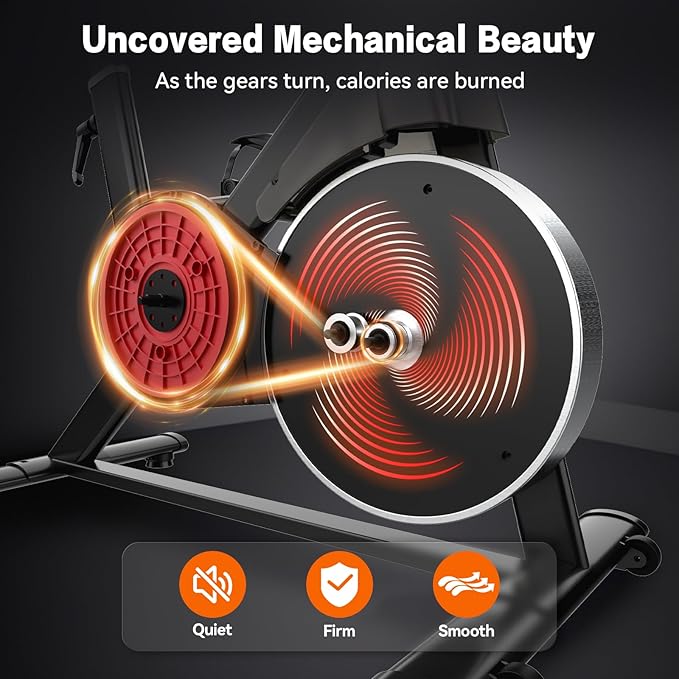 • ULTRA QUIET RIDE UNDER 20DB: This indoor bike uses a belt drive system for ultra-smooth and silent cycling under 20dB. Ideal for early risers or night workouts without disturbing kids, neighbors, or roommates.