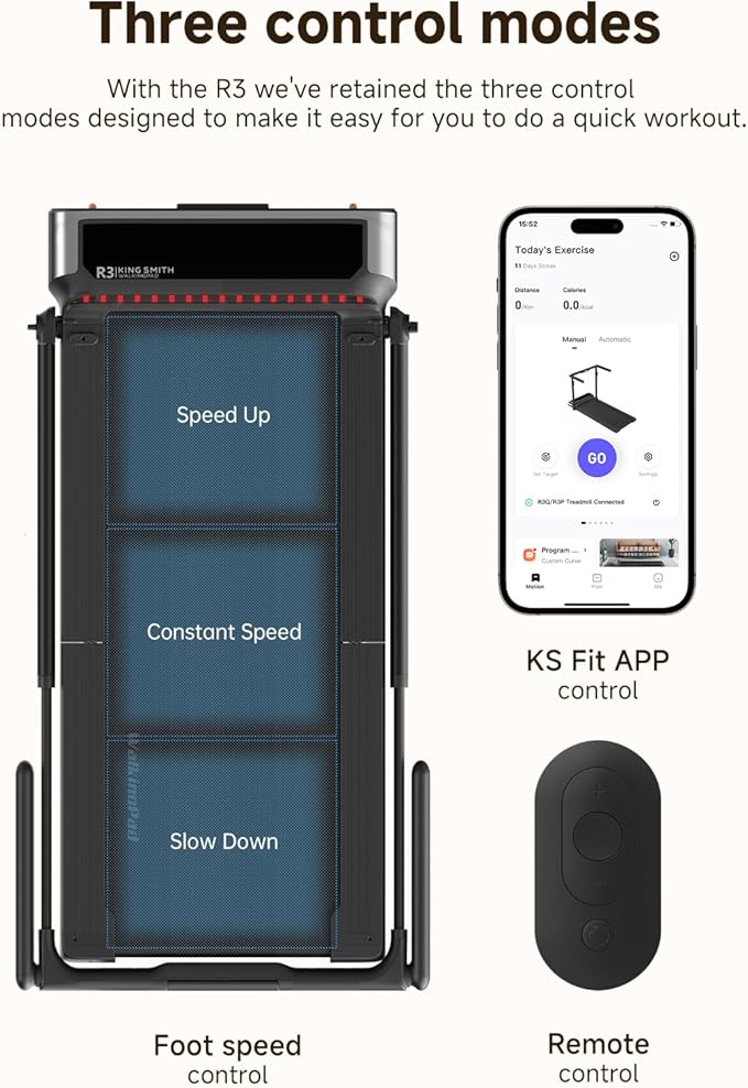 • Adjustable Handrail for Two Workout Modes - Like R1 and R2, R3 Hybrid+ features a height-adjustable handrail that lets you easily switch between two modes. Lower the handrail to use it as an under desk walking pad, speed is limited to 4 mph for safe, steady movement while working. Raise the handrail for full treadmill mode and unlock speeds up to 7.5 mph for brisk walking or running. Perfect for both focused workdays and energetic workouts.