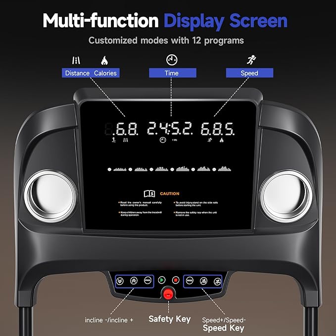 • 【HUGE WINDOWN DISPLAY】The 16 Inch multi-function LED screen of folding treadmill clearly displays time, speed, distance and calories to accurately track your exercise performance. This treadmill with handles have P-button 12 preset programs and countdown modes provide different intensities of exercise and you can choose customized one with ease.