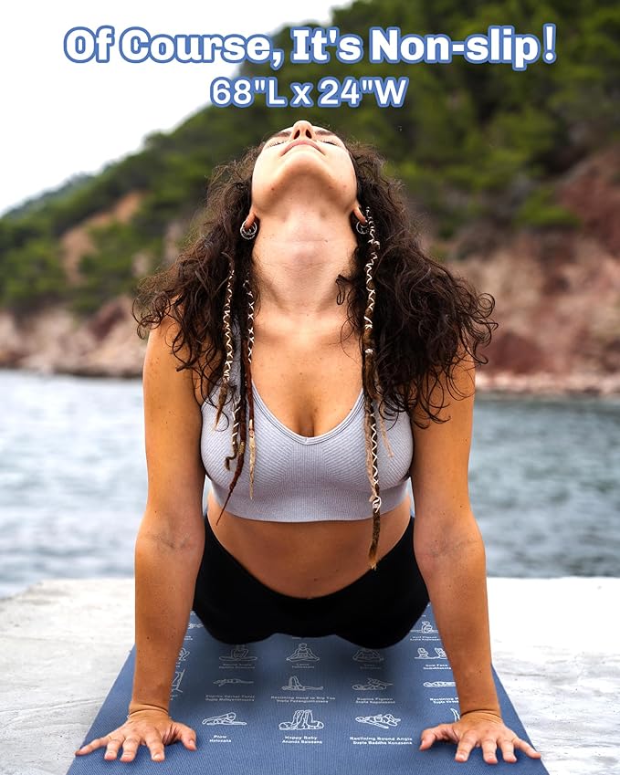 • Enhance your yoga practice with this instructional yoga mat featuring 75 illustrated poses and 75 stretching exercises, perfect for beginners. The 1/4” thick, non-toxic, and non-slip surface ensures safety and comfort during workouts at home or outdoors. Ideal as an exercise mat for home workout or fitness routines