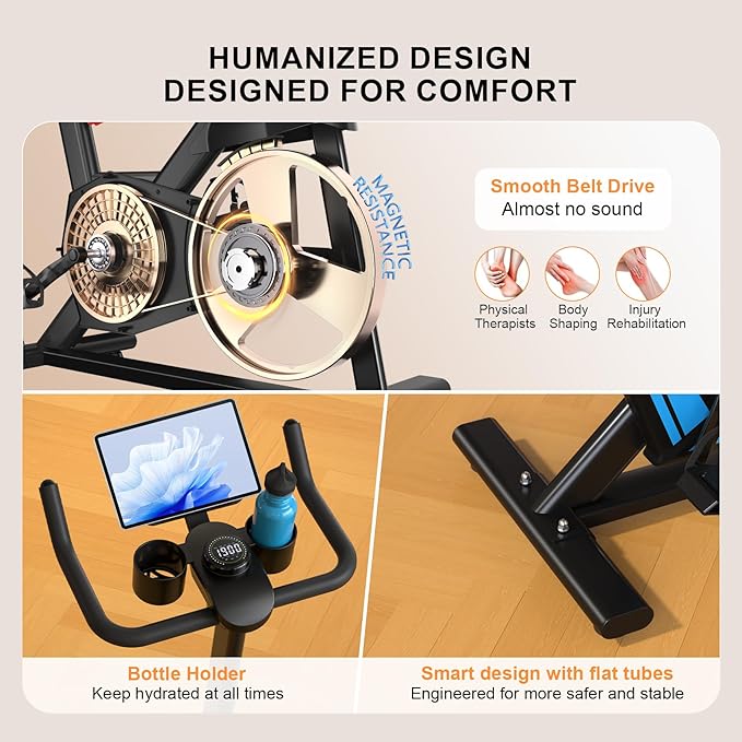 • Track Progress & Stay Entertained: The upgraded LCD monitor displays real-time stats like time, speed, distance, and calories to help you stay focused on your fitness goals. A built-in tablet holder lets you watch videos or listen to music as you ride—making your workouts more engaging and connected.