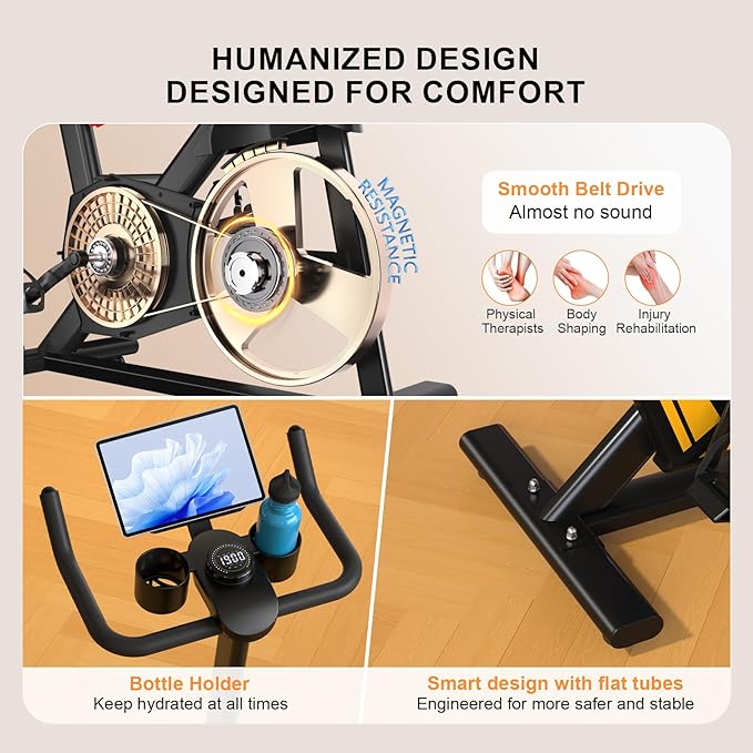 • Safe & Convenient to Use: Built for stability and safety even during intense workouts, the EYESUN exercise bikes for home supports up to 300 lbs. The resistance bar lets you stop the flywheel instantly for added safety, while the convenient adjustable knob allows you to customize resistance levels to suit your training goals. Thoughtful features like a monitor holder for your tablet or phone, a water bottle holder, and built-in transport wheels make your workout experience smooth and hassle-free.