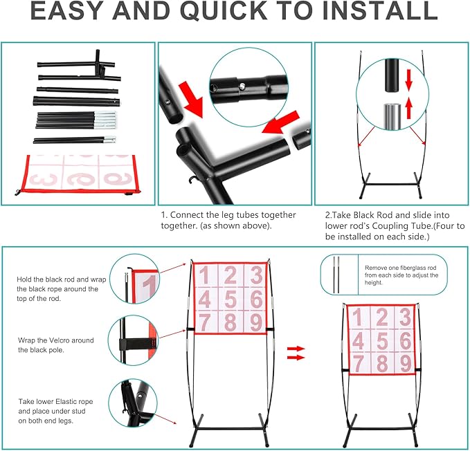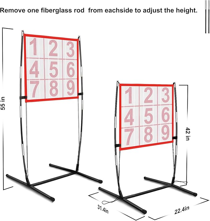 • 【High Quality】The kids dart board is made of high-quality nylon fabric to ensure a firm grip on your power ball and withstand it without breaking.The frame is made of heavy-duty iron ,Painted iron pipes can resist bending, twisting and rust.High quality fiberglass poles has the characteristics of good toughness, high strength and light weight.Comes with 9 soft balls (3 colors) and 4 ground stakes. With these rich accessories, you can enjoy the fun of the activity with your family.