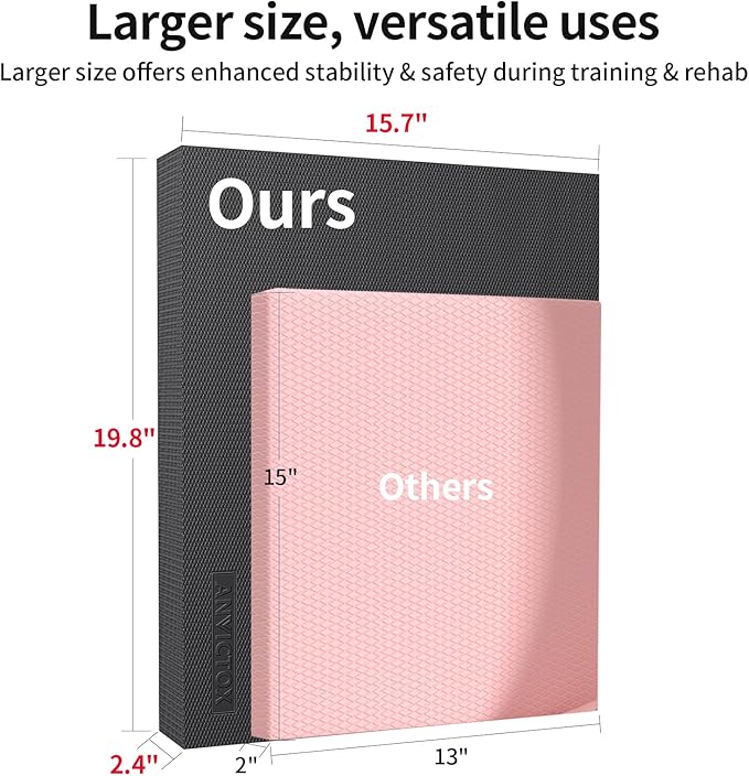 • [How to Choose]ANVICTOX balance pads are available in two sizes: the L size measures 15.8" × 13.2" × 2" (L×W×H), while the XL size measures 19.8" × 15.7" × 2.4" (L×W×H), with the XL pad offering 102 sq in more surface area than the L pad. The compact L pad is portable and suitable for children or petite adults for simple exercises, chair cushions, or daily use; conversely, the XL pad’s larger surface area accommodates taller adults, versatile training needs, and rehabilitation therapy. Therefore, choose based on your specific requirements or consult a physical therapist for personalized advice.‌