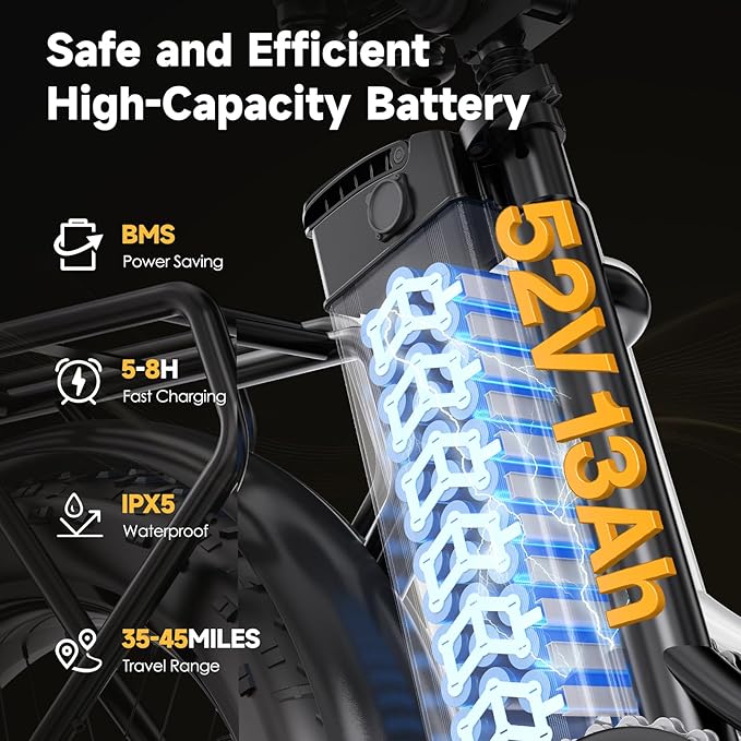 • 52V 13AH Battery:GOKEEP Adult E-bike is equipped with 52V 13AH lithium-ion battery, 58.8V 2AH charger can be quickly charged in 5-8 hours, this adult e-bike has two charging methods, removable battery charging or direct charging, equipped with BMS battery can provide a variety of protection to make the battery safer and longer battery life.
