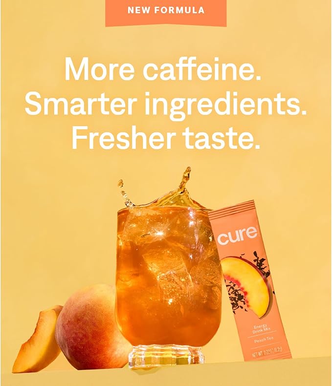 Cure Hydration Performance | Plant-Based Electrolyte Energy Drink Mix | No Added Sugar | Dehydration Relief Powder | 100mg of Caffeine | Non-GMO | Vegan | Pouch of 14 Packets - Peach
