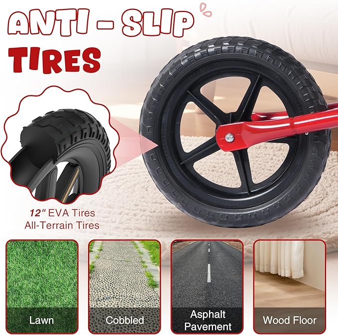 • Multi-Terrain Use Tires: Equipped with durable 12 inch EVA tires, this balance bike can easily navigate various surfaces, such as asphalt pavement, lawn, cobbled, and wood floor, making it perfect for adventures.