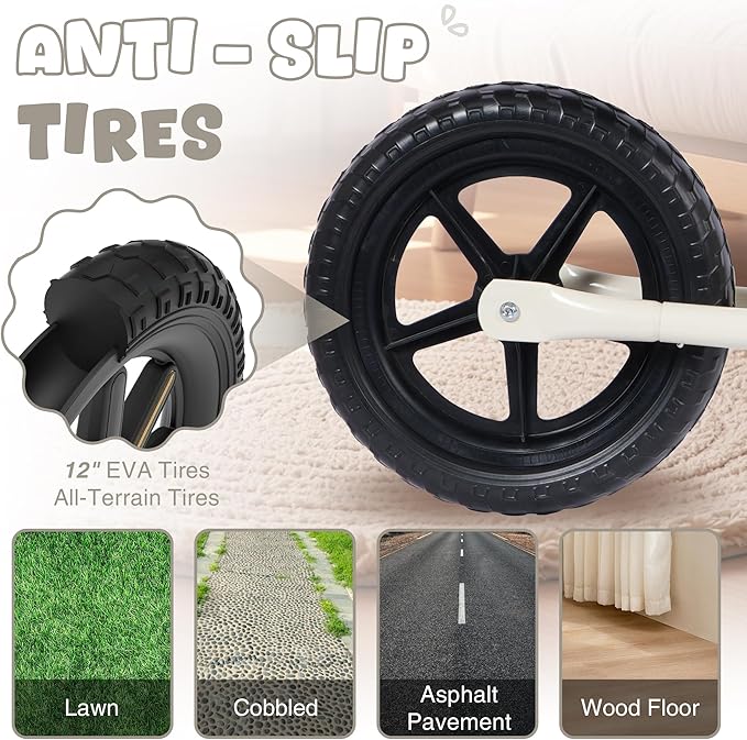 • Multi-Terrain Use Tires: Equipped with durable 12 inch EVA tires, this balance bike can easily navigate various surfaces, such as asphalt pavement, lawn, cobbled, and wood floor, making it perfect for adventures.