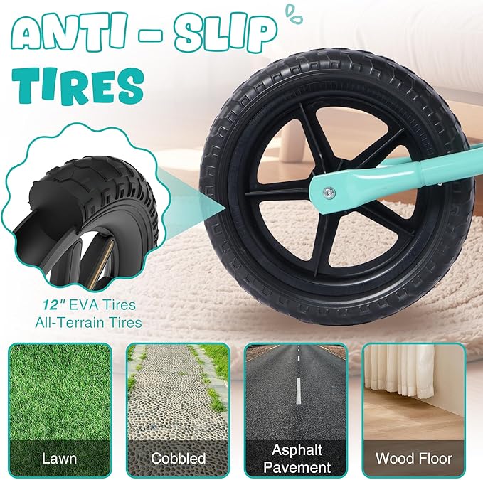 • Multi-Terrain Use Tires: Equipped with durable 12 inch EVA tires, this balance bike can easily navigate various surfaces, such as asphalt pavement, lawn, cobbled, and wood floor, making it perfect for adventures.