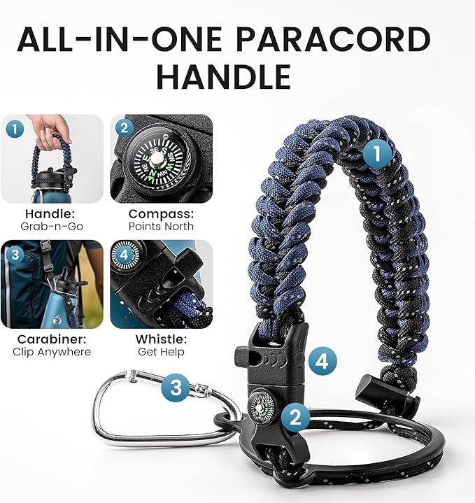 • Adventure Ready Paracord Handle: RAYMYLO 1/4 gallon water jug features a stylish color-coordinated paracord handle with a built-in compass and carabiner clip. This reusable water bottle's paracord handle is lightweight, durable, and perfect for hands-free carrying during hikes, cycling, or camping. Grab & go for spontaneous adventures under the stars!