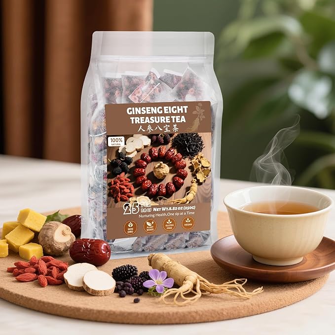 • Ginseng Eight Treasures Tea:Ginseng and Wolfberry Tea has a mellow taste, you can smell the aroma of jujubes and goji berries after steeping, and the tea broth is dark in color and excellent in quality. Naturally caffeine free, it can be consumed at any time of the day