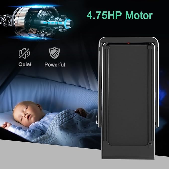 • 𝗗𝗼𝘂𝗯𝗹𝗲 𝗦𝗵𝗼𝗰𝗸 𝗔𝗯𝘀𝗼𝗿𝗽𝘁𝗶𝗼𝗻 𝗦𝘆𝘀𝘁𝗲𝗺: Equipped with damping and silicone diamond systems, this under desk treadmill with 5-layer shockproof and anti-slip running belt offers better protection for knees and joints. In Addition, the 4.75hp powerful motor ensures a quiet and smooth running. Please do not use the treadmill on carpet to avoid overheating.
