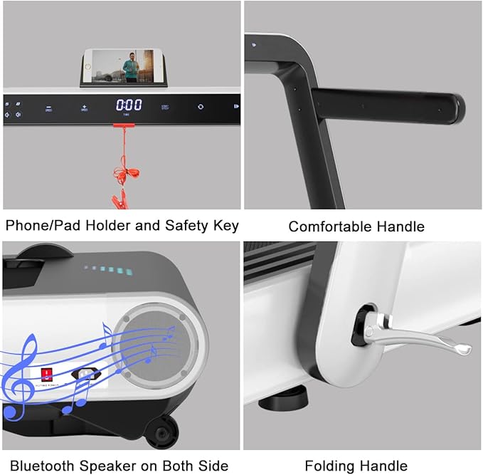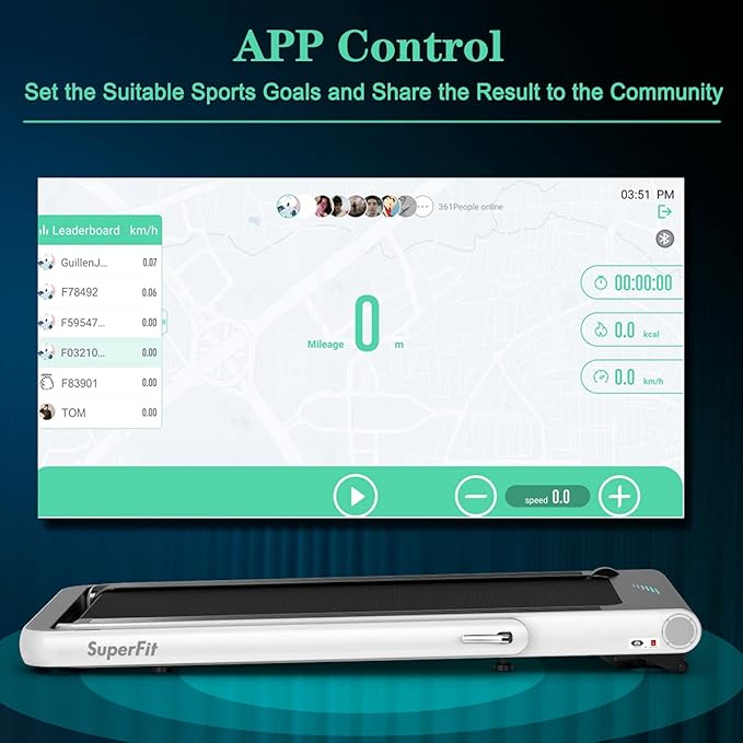 • 𝗦𝗶𝗺𝗽𝗹𝗲 𝗢𝗽𝗲𝗿𝗮𝘁𝗶𝗼𝗻: This under desk treadmill features LED touch screen, offering real-time feedback of calories, pulse, time, distance and speed. The treadmill could also be control and adjust via App and remote. Furthermore, all sports data will be kept when you press the pause key for water break and you can switch speed unit between mile and km in APP.