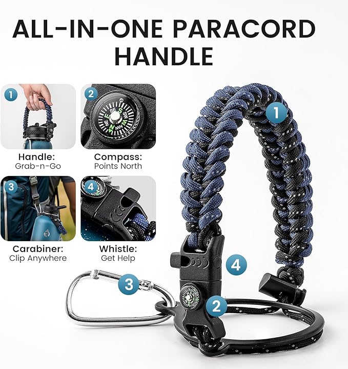• Adventure Ready Paracord Handle: RAYMYLO 1 gallon water jug features a stylish color-coordinated paracord handle with a built-in compass and carabiner clip. This reusable water bottle's paracord handle is lightweight, durable, and perfect for hands-free carrying during hikes, cycling, or camping. Grab & go for spontaneous adventures under the stars!