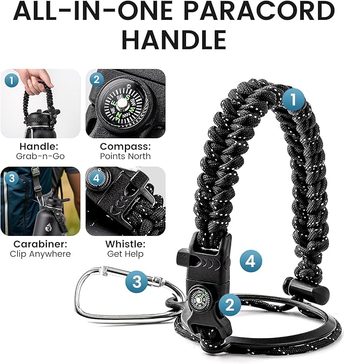 • Adventure Ready Paracord Handle: RAYMYLO 1 gallon water jug features a stylish color-coordinated paracord handle with a built-in compass and carabiner clip. This reusable water bottle's paracord handle is lightweight, durable, and perfect for hands-free carrying during hikes, cycling, or camping. Grab & go for spontaneous adventures under the stars!