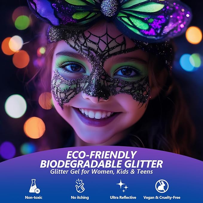 • Eco-Friendly Glitter: This super sparkly glitter contains no harmful chemicals, is safe for skin, and breaks down in the environment, ensuring the highest quality of the product