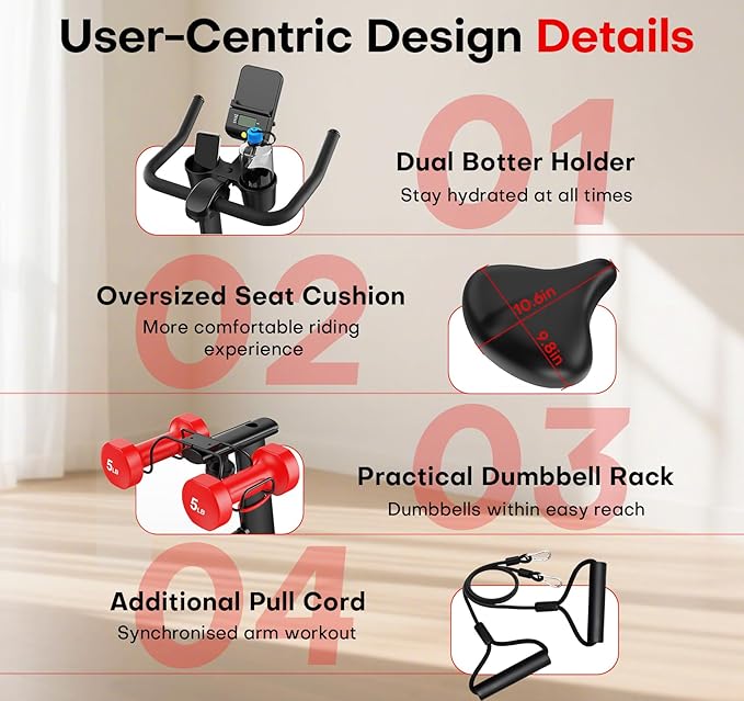• [User-Focused Design Details]: This indoor bike trainer comes with a unique dumbbell rack for convenient storage (Note: dumbbells not included). The water bottle holder has been upgraded from 1 to 2, allowing you to store bottles, towels, or mobile phones etc. Attach the 2pcs arm resistance bands to the bike for simultaneous arm training while cycling. Quality you can trust —Every detail of our exercise bikes!