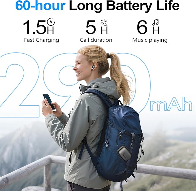 • 60 Hours Battery Life for Uninterrupted Listening:Say goodbye to battery anxiety! Enjoy 12 hours of non-stop playback on a single charge, extended to 60 hours with the compact charging case. Commuting, workouts, or travel—your music and calls never stop. With fast charge, just 10 minutes of charging delivers 2 hours of playtime, so your rhythm never break