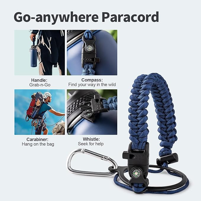 • Palm Fitting Paracord Handle: Compared to handle lids, nylon paracord on the bottle gives you more choices in terms of color coordination and coziness on your hands. Match the handle with your bottle to make a complete outdoorsy look. Compass and carabiner can be lifesavers for hiking and other expeditions