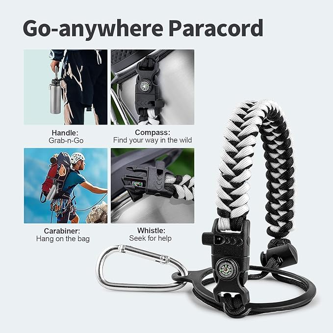 • Palm Fitting Paracord Handle: Compared to handle lids, nylon paracord on the bottle gives you more choices in terms of color coordination and coziness on your hands. Match the handle with your bottle to make a complete outdoorsy look. Compass and carabiner can be lifesavers for hiking and other expeditions