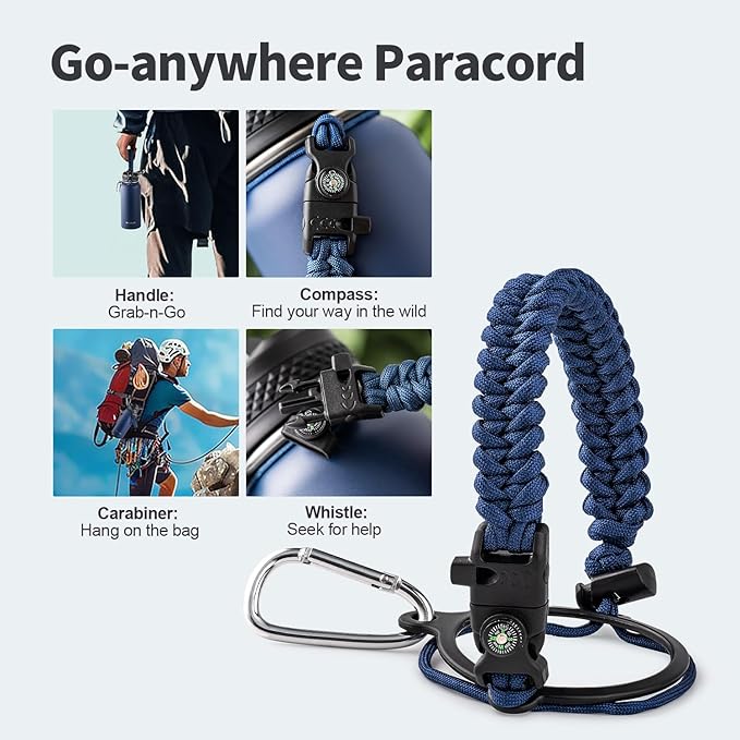 • Palm Fitting Paracord Handle: Compared to handle lids, nylon paracord on the bottle gives you more choices in terms of color coordination and coziness on your hands. Match the handle with your bottle to make a complete outdoorsy look. Compass and carabiner can be lifesavers for hiking and other expeditions
