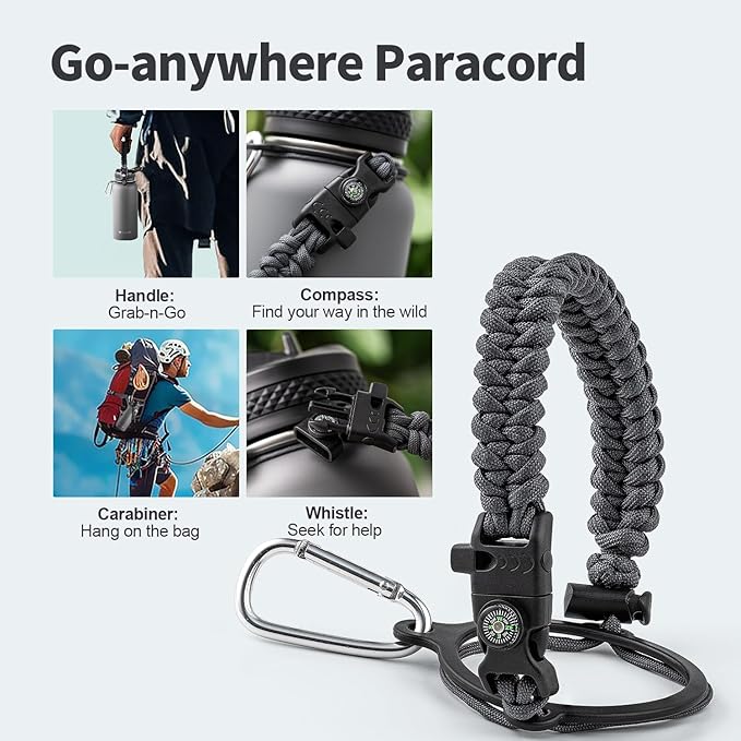 • Palm Fitting Paracord Handle: Compared to handle lids, nylon paracord on the bottle gives you more choices in terms of color coordination and coziness on your hands. Match the handle with your bottle to make a complete outdoorsy look. Compass and carabiner can be lifesavers for hiking and other expeditions