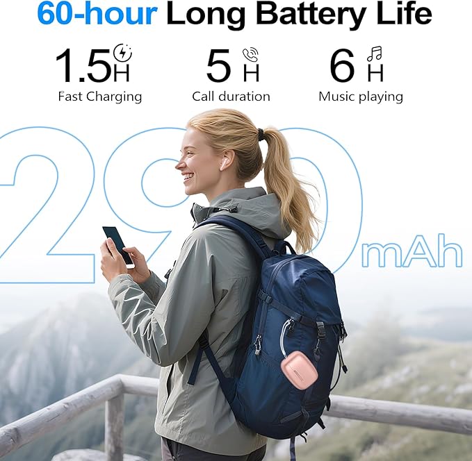 • 60 Hours Battery Life for Uninterrupted Listening:Say goodbye to battery anxiety! Enjoy 12 hours of non-stop playback on a single charge, extended to 60 hours with the compact charging case. Commuting, workouts, or travel—your music and calls never stop. With fast charge, just 10 minutes of charging delivers 2 hours of playtime, so your rhythm never break
