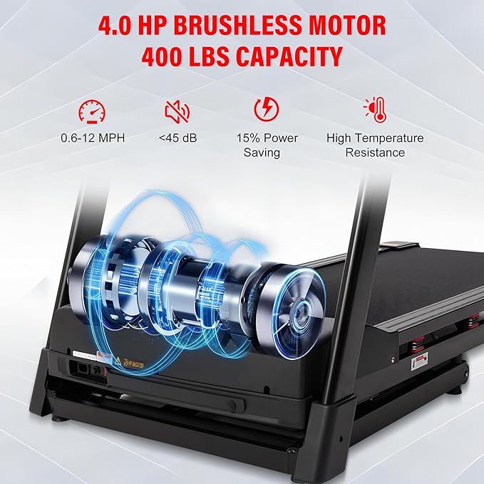 • 【4.0 HP Powerful Motor & 400 lbs Capicaty】 The treadmill for home equipped with a brushless 4.0 HP motor, supports up to the speed of 12 MPH and 400 lbs weight capicaty, can bring you and your family a more free and comfortable running experience. Unlike traditional motors, this friction-free design ensures ultra-quiet operation and long-lasting performance.