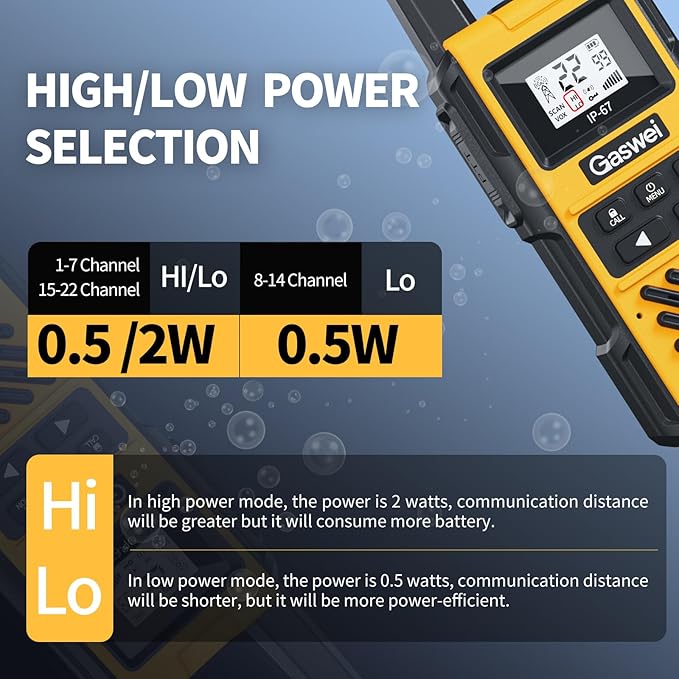 • 【Solid and Durable】- "Gaswei" Walkie Talkies were trusted by the demanding professionals around the world. IP67 Waterproof and dustproof rating, Shock-resistant and slip-resistant design, able to withstand falls from up to 2M. All kinds of complex and severe environments can be easily faced.