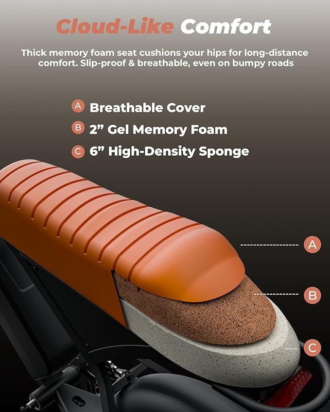 • Ride Smarter, Ride Safe-Ride in cloud-like comfort with EB5 Mini e-bike's innovative triple-layer wide seat design. Choose from 5 smart riding modes (PAS/Electric/Cruise/Walk/Pedal)and integrated USB charging, it delivers exceptional comfort and safety across all terrains.