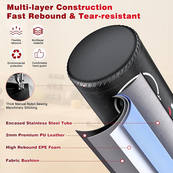 • Rebound Shock Absorption: Multi-layer construction with wrapped stainless steel tube, 2mm thick PU leather, high-density EPE foam, and eco-friendly fabric padding; 360° shock-absorbing rubber encased in foam (safer than springs for kicking) with quick-detach hook and loop fastener; Longlasting, quick rebound, and hand-protecting hardness balance