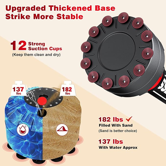 • Sturdy Base: The boxing bag is equipped with 12 strong detachable suction cups and a reinforced circular ABS base; Fill with water (137lb) or sand (182lb) for exceptional stability on various surfaces