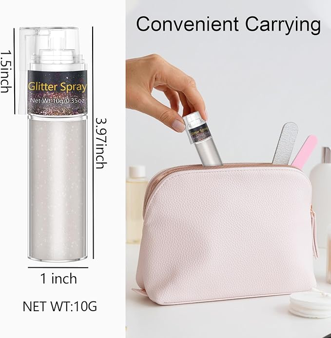 • Lightweight Hair Glitter Spray: Shake well before use, then lightly mist your hair and skin with our body glitter spray for a soft, shimmering glow that stays put. Compact and travel-friendly, this portable bottle lets you dazzle wherever you go—shine anytime, anywhere! Also, our hair glitter can be removed with water or soap.
